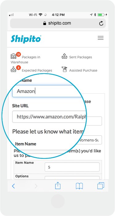 Click on Assisted Purchase after you login into your account. Then click on New Assisted Purchase. Give us a description, quantity of item desired, product number, and total price including shipping to our warehouse. You can do this by placing your selected items into a shopping cart on your favorite website, go to checkout, enter our shipping address and this will give you the total cost. You will then enter all that information into the form and click Next,